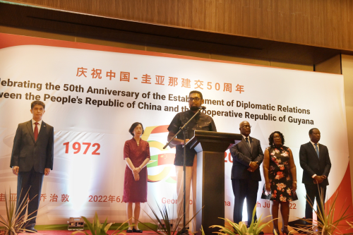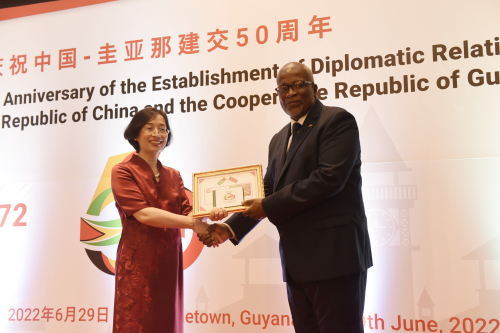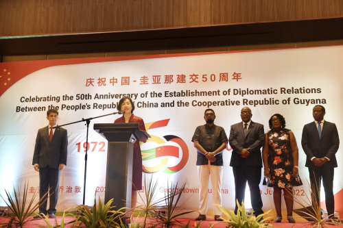 2022年6月29日,驻圭亚那使馆举办中圭建交50周年庆祝仪式。驻圭亚那大使郭海燕、圭亚那总统阿里、总理菲利普斯、副总统贾格迪奥、大法官卡明斯-爱德华兹、外长托德等大多数内阁成员、各界友好人士,驻圭外交使团,援圭医疗队、孔子学院、在圭中资企业代表以及旅圭华侨华人代表等100多人出席。庆祝仪式在欢腾雄劲的舞狮表演中开场,郭海燕大使和阿里总统先后发表了热情洋溢的致辞。