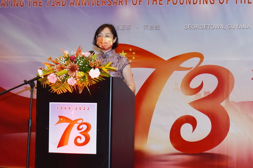 2022年10月3日,驻圭亚那使馆在乔治敦万豪酒店举办庆祝中华人民共和国成立73周年招待会。驻圭亚那大使郭海燕、圭亚那总理菲利普斯、前总统拉莫塔、议长纳迪尔、外长托德、财政部长辛格、内政部长本、公共工程部长埃奇希尔、人事部长帕拉格、美洲印第安人事务部长苏凯、国防军参谋长贝斯等各界友好人士,加共体秘书长巴尼特、驻圭外交使团,孔子学院、在圭中资企业代表以及旅圭华侨华人代表等200多人出席。