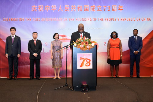 驻圭亚那大使郭海燕在招待会上致辞表示,新中国成立73年来,特别是2012年中国共产党的十八大以来,在中国共产党的领导下,中国实现了世所罕见的经济快速发展奇迹和社会长期稳定奇迹,迎来了从站起来、富起来到强起来的历史性飞跃,迎来了实现伟大复兴的光明前景。今年以来,中国经济克服疫情反弹带来的不利影响,在上半年实现2.5%的正增长。北京冬奥会取得圆满成功,为世界奉献了一届简约、安全、精彩的奥运盛会。我们还成功举办博鳌亚洲论坛、金砖国家领导人会晤、全球发展高层对话会,继续为推动世界经济复苏发挥引领作用。习近平主席提出的全球发展倡议和全球安全倡议,是破解当今世界面临的发展和安全难题,完善全球发展和安全治理体系的中国方案,受到国际社会普遍欢迎和支持。无论国际风云如何变幻,中国始终做世界和平的建设者、全球发展的贡献者、国际秩序的维护者、公共产品的提供者、热点问题的斡旋者。