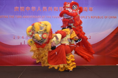 招待会现场播放了展现中国10年来经济社会发展成就的纪录片,圭亚那中华会馆和圭大孔子学院还为与会嘉宾奉献了舞狮、汉服秀、歌曲《月亮代表我的心》及合唱《歌唱祖国》等精彩纷呈并独具中国特色的文艺节目。