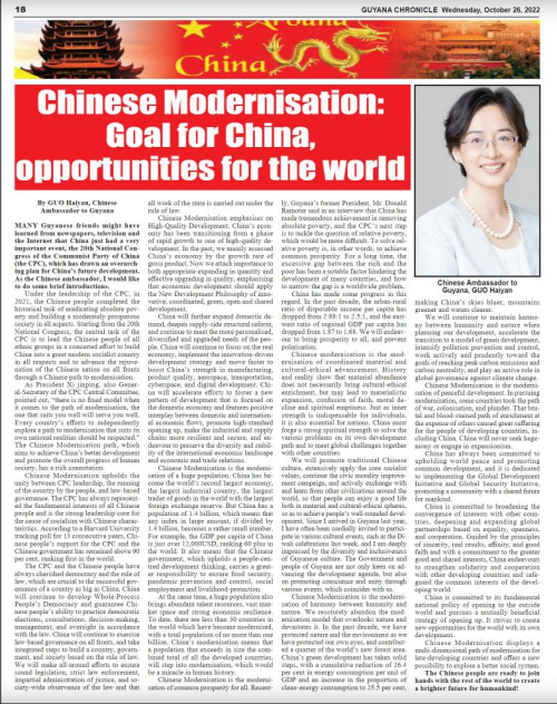 2022年10月26日,驻圭亚那大使郭海燕在《圭亚那纪事报》发表署名文章《中国式现代化:中国的目标,世界的机遇》。全文如下: