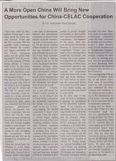 2018年4月13日,苏里南最大日报《苏里南时报》全文刊登驻苏里南大使张晋雄署名文章《更加开放的中国将为中拉合作带来新机遇》。