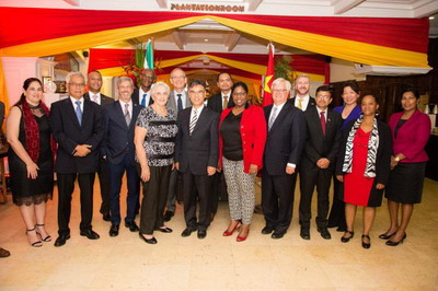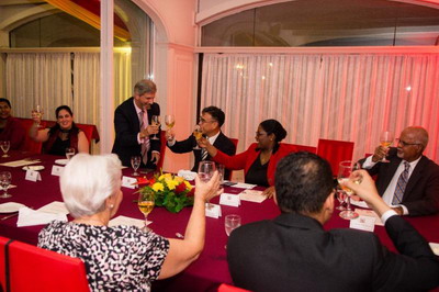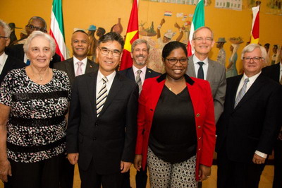 近日,苏里南外交部长拜赫勒为驻苏里南大使张晋雄举行离任欢送晚宴。苏外交部外长顾问柯本斯、常秘楚伊德曼等官员,驻苏外交使团团长、委内瑞拉大使以及巴西、美国、法国、印尼、阿根廷、古巴、圭亚那等各国驻苏使节出席。