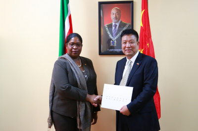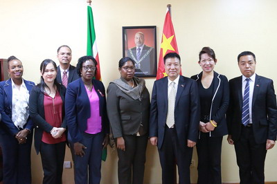 2018年8月20日,驻苏里南大使刘全向苏外交部长拜赫勒递交国书副本。苏外交部常秘麦肯涛什、特劳德曼等在座。