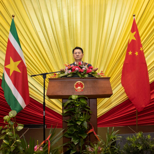 2025年9月26日,驻苏里南使馆举行庆祝中华人民共和国成立76周年招待会。驻苏里南大使林棘,苏副总统鲁斯兰德、多位内阁部长、国会议员、政党领袖、社会各界人士、外国驻苏使节、旅苏侨胞、中资企业代表等350余人出席。