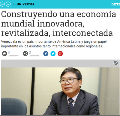 近日,委内瑞拉主流媒体《宇宙报》在网站上整版刊登赵本堂大使署名文章《携手前行,共同构建创新、活力、联动、包容的世界经济》。署名文章全文如下: