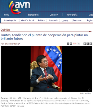 近日,委内瑞拉官方通讯社委通社(AVN)在网站上整版刊登赵本堂大使署名文章《共架合作之桥,共绘美好画卷》。署名文章全文如下: