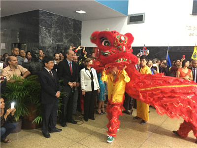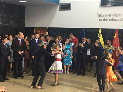 随后,赵本堂大使、梅嫩德斯部长、浦玉忠书记、汉森校长以及孔院中外方院长共同为孔子学院揭牌。来宾们参观了孔院教室和语音室,并现场观看了委内瑞拉民族舞蹈和中国舞龙表演等文化展示活动。