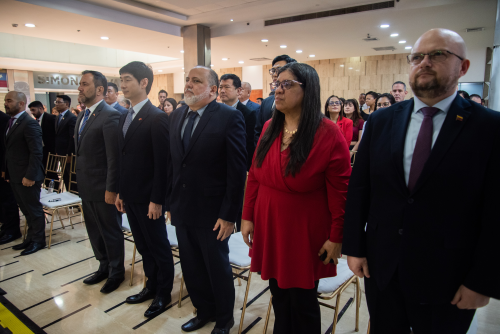 2023年6月29日,委内瑞拉外交部在部内大堂举办庆祝中委建交49周年文化活动,委外长希尔、驻委内瑞拉大使蓝虎出席并致辞,护民官鲁伊斯、委外交部主要官员和驻委使团参加活动。