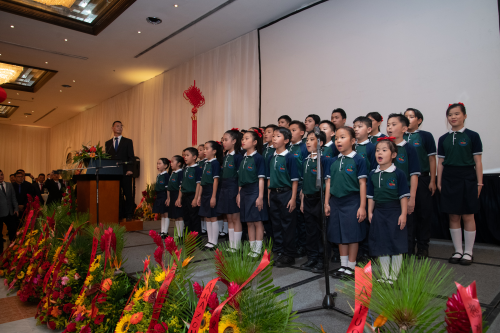 华文学校学生现场唱响两国国歌,气氛热烈友好。