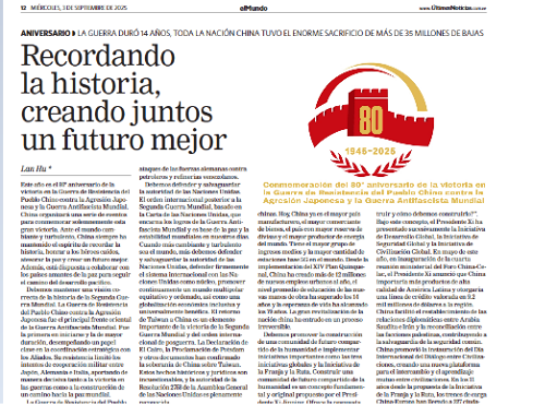 2025年9月3日,驻委内瑞拉大使蓝虎在委主流媒体《最新消息报》发表署名文章《铭记历史 共创未来》,深入阐释正确二战史观,表示将继续同委维护联合国权威和世界和平,为携手共进的中拉命运共同体开创更加美好的未来。中文全文如下: