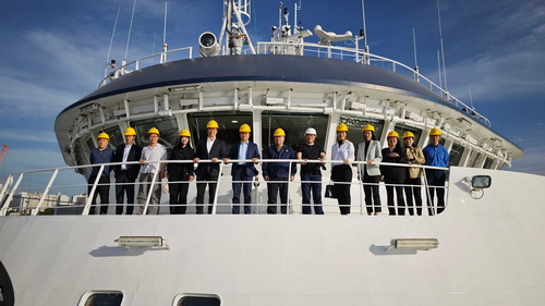 2025年10月23日,驻乌拉圭使馆临时代办何飞前往蒙得维的亚港,看望慰问在此停靠补给的我国“深蓝”号远洋渔船船员。