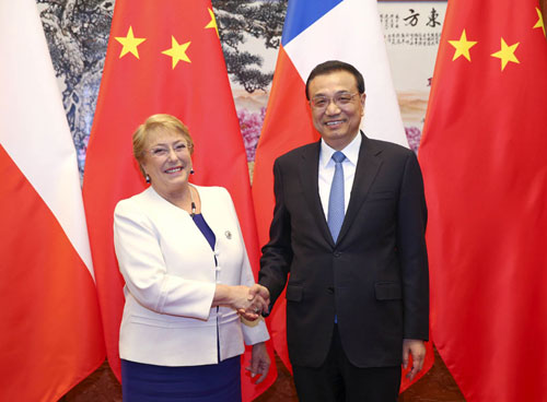 2017年5月14日下午,国务院总理李克强在人民大会堂会见来华进行国事访问并出席“一带一路”国际合作高峰论坛的智利总统巴切莱特。