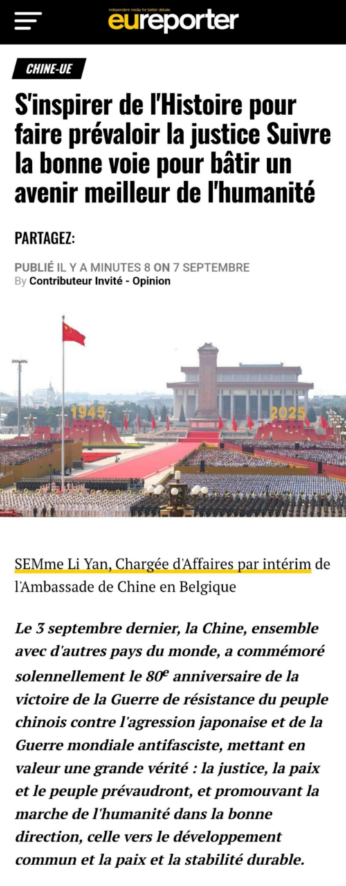 2025年9月7日,驻比利时使馆临时代办李艳在《欧盟记者报》发表署名文章《以史为鉴 把握千秋胜负之理 遵道而行 开创人类美好未来》,全文如下: