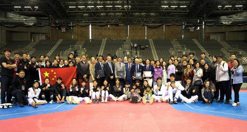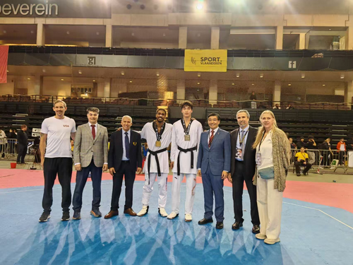 2026年3月22日,驻比利时大使费胜潮和使馆部分同志前往林堡省洛默尔出席第四十五届比利时跆拳道公开赛。