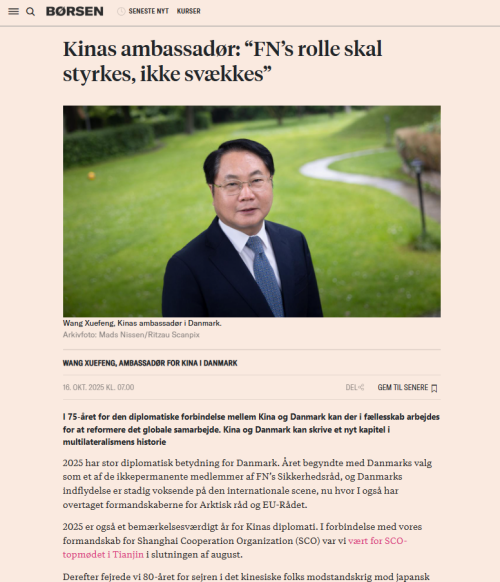 2025年10月16日,驻丹麦大使王雪峰在丹主流媒体《商报》发表题为《全球治理倡议为动荡世界贡献中国方案》的署名文章,中文全文如下: