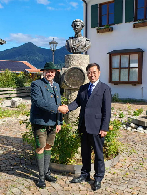 2025年9月15日,驻慕尼黑总领事邱学军访问巴伐利亚州施旺高镇,同镇长林克友好交流。