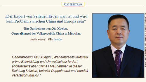 2025年10月2日,驻慕尼黑总领事邱学军在德国《新团结》杂志第40-41期发表署名文章《稀土出口从来不是、也不应成为中欧之间的问题》。全文如下: