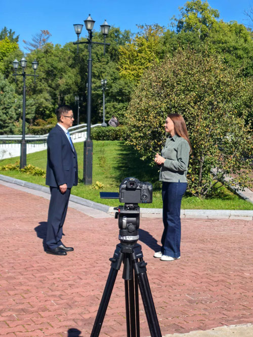 驻哈巴罗夫斯克总领馆现场向与会者发放中方对俄免签政策宣介材料。姜总领事还就中俄旅游等人文领域合作接受领区主流媒体采访。