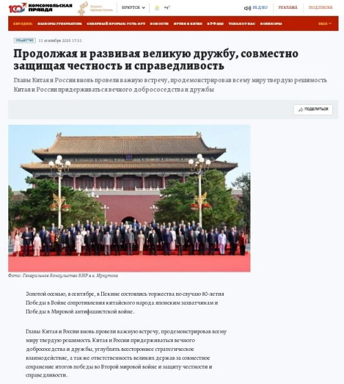 金秋9月,北京隆重举行纪念中国人民抗日战争暨世界反法西斯战争胜利80周年大会。中俄两国元首再度举行重要会晤,向世界展现了中俄坚持永久睦邻友好,深化全面战略协作的坚定决心,以及共同维护二战胜利成果,携手捍卫公平正义的大国担当。