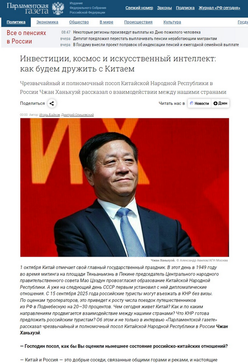 2025年9月30日,驻俄罗斯大使张汉晖接受《今日俄罗斯联邦》杂志书面采访。采访全文如下: