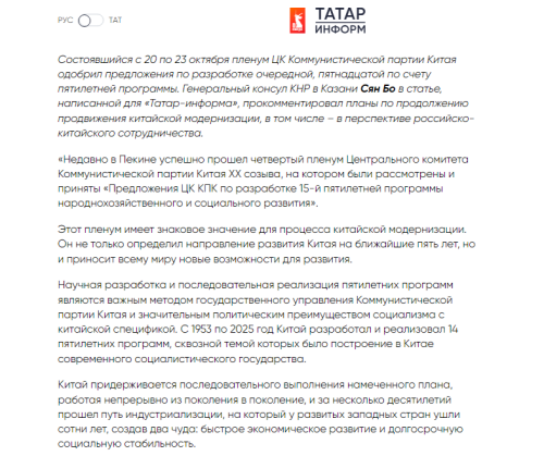 2025年11月11日,驻喀山总领事向波在俄罗斯鞑靼斯坦通讯社、《共和国报》、《实时网》、下诺夫哥罗德州《真理报》、萨马拉州《观察网》等媒体发表署名文章《迈向“十五五”:接续推进中国式现代化》,宣介党的二十届四中全会精神。全文如下: