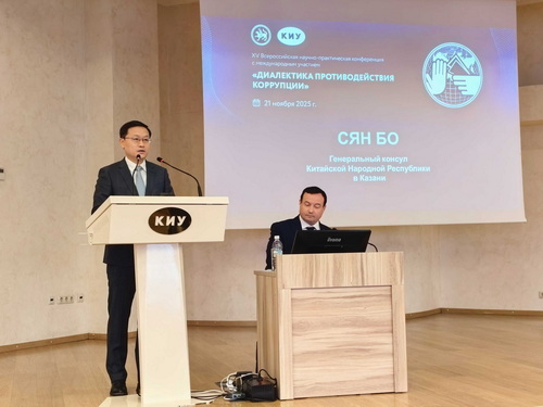 2025年11月21日,驻喀山总领事向波赴喀山创新大学宣介中央八项规定精神。比克耶夫第一副校长和该校师生等出席。