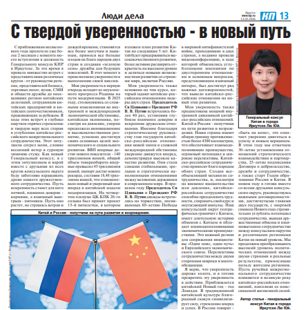 2026年2月13日,驻伊尔库茨克总领事刘渝在俄罗斯《共青团真理报》、《中国与俄罗斯》杂志发表署名文章《坚定信心启新程》,全文如下: