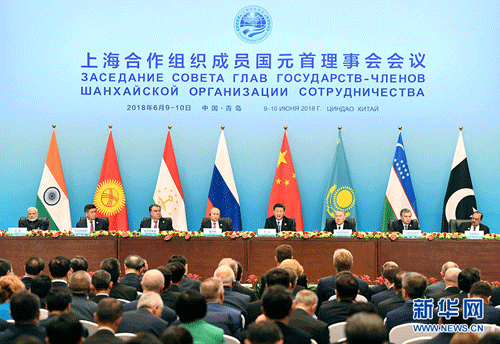 2018年6月10日,上海合作组织成员国领导人共同会见记者。国家主席习近平作为主席国元首发表讲话。印度总理莫迪、哈萨克斯坦总统纳扎尔巴耶夫、吉尔吉斯斯坦总统热恩别科夫、巴基斯坦总统侯赛因、俄罗斯总统普京、塔吉克斯坦总统拉赫蒙、乌兹别克斯坦总统米尔济约耶夫出席。