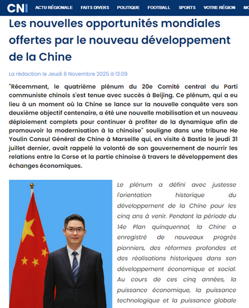 2025年11月6日,驻马赛总领事何有麟在科西嘉主流媒体《科西嘉网络信息报》发表署名文章《中国新发展的世界新机遇》,专题宣介中共二十届四中全会精神。全文如下: