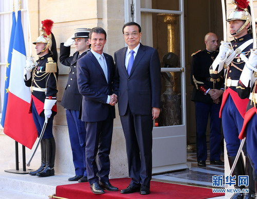 李克强表示,中法关系历经50个春秋,战略互信不断巩固,务实合作加速转型升级,人员往来便利化举措不断出新,在国际和地区热点问题上保持密切沟通。双方应把握机遇,再接再厉,加强高层交往,增进战略互信,推动中法关系继续全面稳定快速发展。
