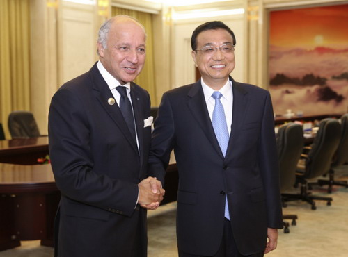 2015年9月3日下午,李克强在人民大会堂会见来华出席中国人民抗日战争暨世界反法西斯战争胜利70周年纪念活动的法国外长法比尤斯。