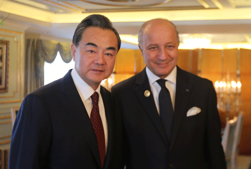 2015年9月3日,外交部长王毅在北京同来华出席中国人民抗日战争暨世界反法西斯战争胜利70周年纪念活动的法国外交和国际发展部长法比尤斯举行会谈。