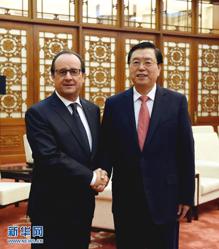 2015年11月3日,全国人大常委会委员长张德江在人民大会堂会见了法国总统奥朗德。