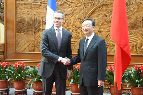 杨洁篪表示,中芬关系有着坚实的政治、经济和民意基础,近年来发展良好,各领域合作富有成果,双方在国际及地区事务中也有着很好的沟通与协调。中方对芬兰长期坚持一个中国政策表示赞赏,愿以明年两国建交60周年为契机,与芬方共同努力,进一步加强各领域互利合作,推动两国关系取得更大发展。