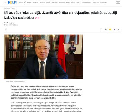 2021年6月10日,驻拉脱维亚大使梁建全在拉脱维亚最大新闻网站德尔菲(DELFI)发表题为《坚持开放包容、推进合作共赢》的署名文章。德尔菲新闻网系拉脱维亚最大网络媒体,在拉开展拉脱维亚语和俄语新闻报道,受众逾70万人。全文(中文译文)如下: