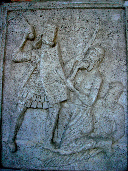 参观完博物馆,我们来到图拉真胜利纪念碑前。站在高40米的圆形纪念碑下,人显得是那么弱小。碑体呈宽大的圆柱形,而下部是两个六角形的石板底座。围着碑体镶嵌着54块石雕,表现了罗马军队备战出发,安营扎寨,俘获敌人,凯旋归来。石雕在刻划人物的容貌、民族特点、服饰等方面,都具有很强的历史真实性,不仅是珍贵的历史遗产,也是具有重要军事历史文献价值的艺术品。