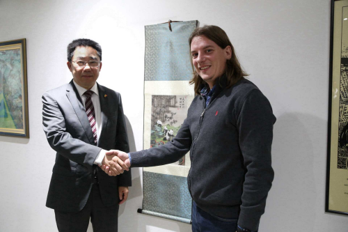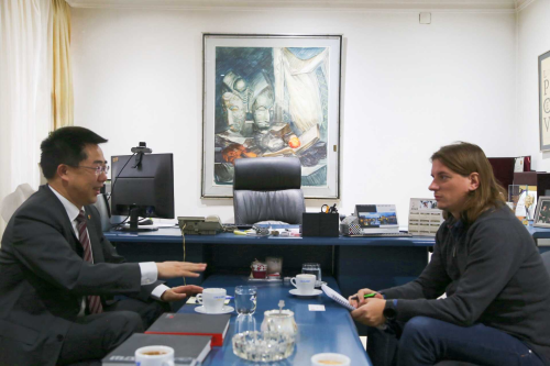 2023年11月28日,驻北马其顿大使张佐会见圣基里尔—麦托迪大学斯科普里戏剧艺术学院院长贝斯福德,就加强中北马人文交流交换意见。