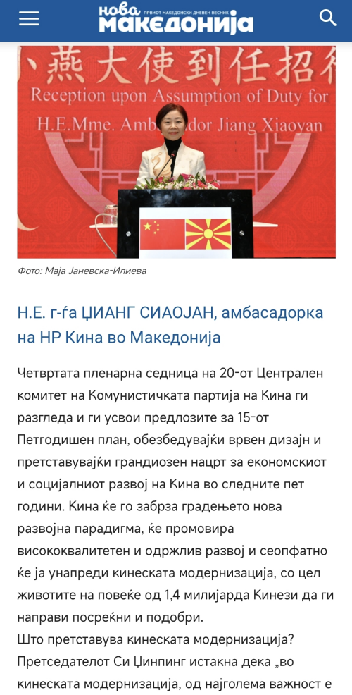 2025年12月20日,《新马其顿报》刊发驻北马其顿大使蒋小燕署名文章《使发展成果更多更公平惠及人民——解码中国式现代化》,全文如下: