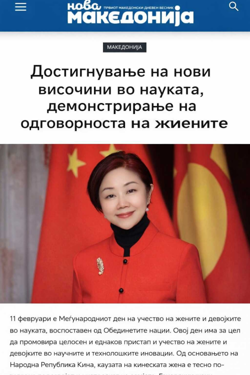 在“妇女和女童参与科学国际日”之际,《新马其顿报》于2026年2月13日刊发驻北马其顿大使蒋小燕署名文章《勇攀科学高峰 书写巾帼担当》。全文如下: