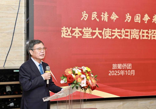 2025年10月13日,驻葡萄牙大使赵本堂偕夫人许立新出席旅葡侨团为大使夫妇举行的离任招待会。葡萄牙中华总商会蔡文显会长等旅葡侨领代表百余人出席。
