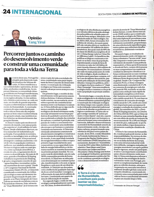 2026年4月17日,驻葡萄牙大使杨义瑞在葡萄牙主流媒体《新闻日报》(Diário de Notícias)发表署名文章《携手同行绿色发展道路,共建地球生命共同体》,全文如下: