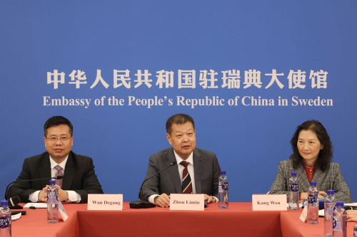 周大使介绍了中国经济发展最新成就,解读了“十五五”规划相关内容,表示中国将以高水平对外开放推动高质量发展,愿与世界各国共享机遇、共创未来。中瑞两国经贸往来源远流长,双方都致力于维护多边主义、支持经济全球化,合作基础好、产业互补性强,双边经贸合作未来可期。中国愿与瑞典深化务实合作,推动双边经贸关系开启新篇章。