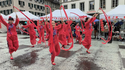 当日,伯尔尼老城广场国旗迎风飘扬。非遗画作、制作香囊、茶艺点茶、漆扇、民族服饰、植物拓印、中国美食、游戏互动等近20种文化体验吸引了当地民众参与,充分显示了中国文化的强大魅力。