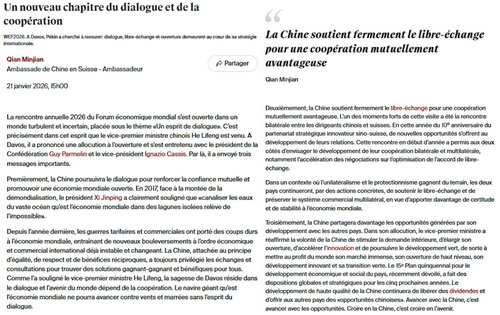 2026年1月21日,驻瑞士大使钱敏坚在瑞士法语媒体《财经报》发表题为《谱写对话合作新篇章》的署名文章,介绍何立峰副总理出席世界经济论坛2026年年会并访问瑞士成果。