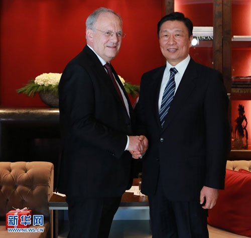 当地时间1月21日,国家副主席李源潮在瑞士达沃斯出席世界经济论坛2016年年会期间会见瑞士联邦主席施奈德-阿曼。