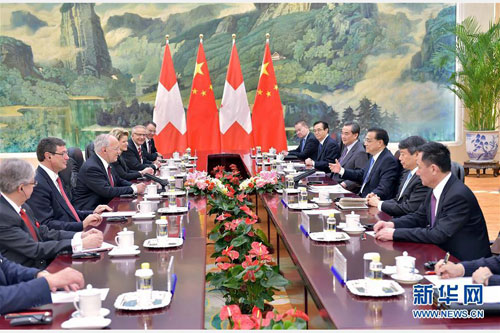李克强表示,中方高度重视发展同瑞士的关系。习近平主席明天将同你举行会谈。两国自贸协定生效近两年来,有力提振了经贸合作,去年中瑞双边贸易在中欧贸易整体下滑背景下逆势增长。中方愿同瑞方弘扬传统友谊,深化务实合作,以贸易与金融双轮为驱动,以创新合作为新增长点,助力中瑞合作提速升级,继续在中国同欧洲国家关系中发挥引领和示范作用。