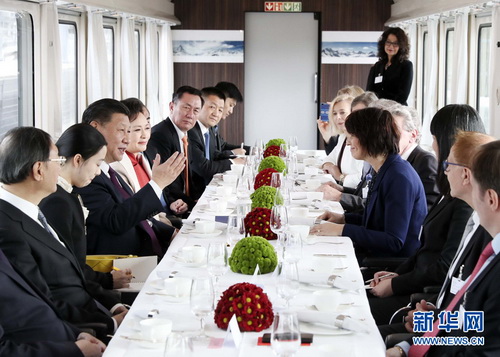 在专列行进过程中,习近平和夫人彭丽媛受洛伊特哈德主席夫妇邀请,在轻松愉快的氛围中品茶畅谈。