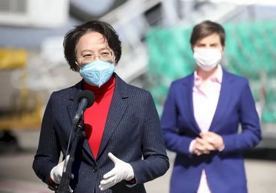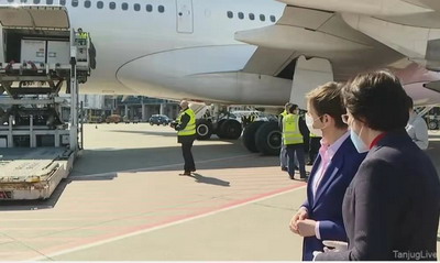 2021年4月5日,塞尔维亚采购的新一批中国疫苗由塞方专机运抵首都贝尔格莱德。塞总理布尔纳比奇赴机场迎接,驻塞尔维亚大使陈波陪同。