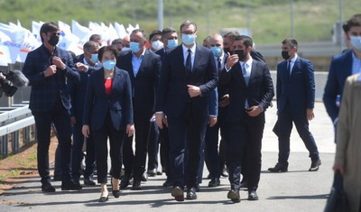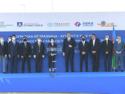 2021年4月29日,塞尔维亚总统武契奇出席中国电建承建的贝尔格莱德绕城公路B4标段通车仪式。驻塞尔维亚大使陈波,塞建设、交通和基础设施部部长莫米罗维奇等一同出席。